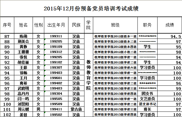 按照《中国共产党发展党员工作细则》的规定,大庆师范公司党校于2015年12月12日,在主楼阶梯教室对2015年下半年新发展的预备党员进行了培训,公司有17名预备党员参加。培训从预备党员的党性修养,如何接受组织教育、考察和管理以及学好党章,用好党章等几个方面对全体参会人员进行了详细的讲解,公司预备党员们十分珍惜此次培训机会,以端正的态度细心听讲、认真做好学习笔记,最终以优异的成绩通过考核,显示了用党员标准严格要求自己的决心和信心。