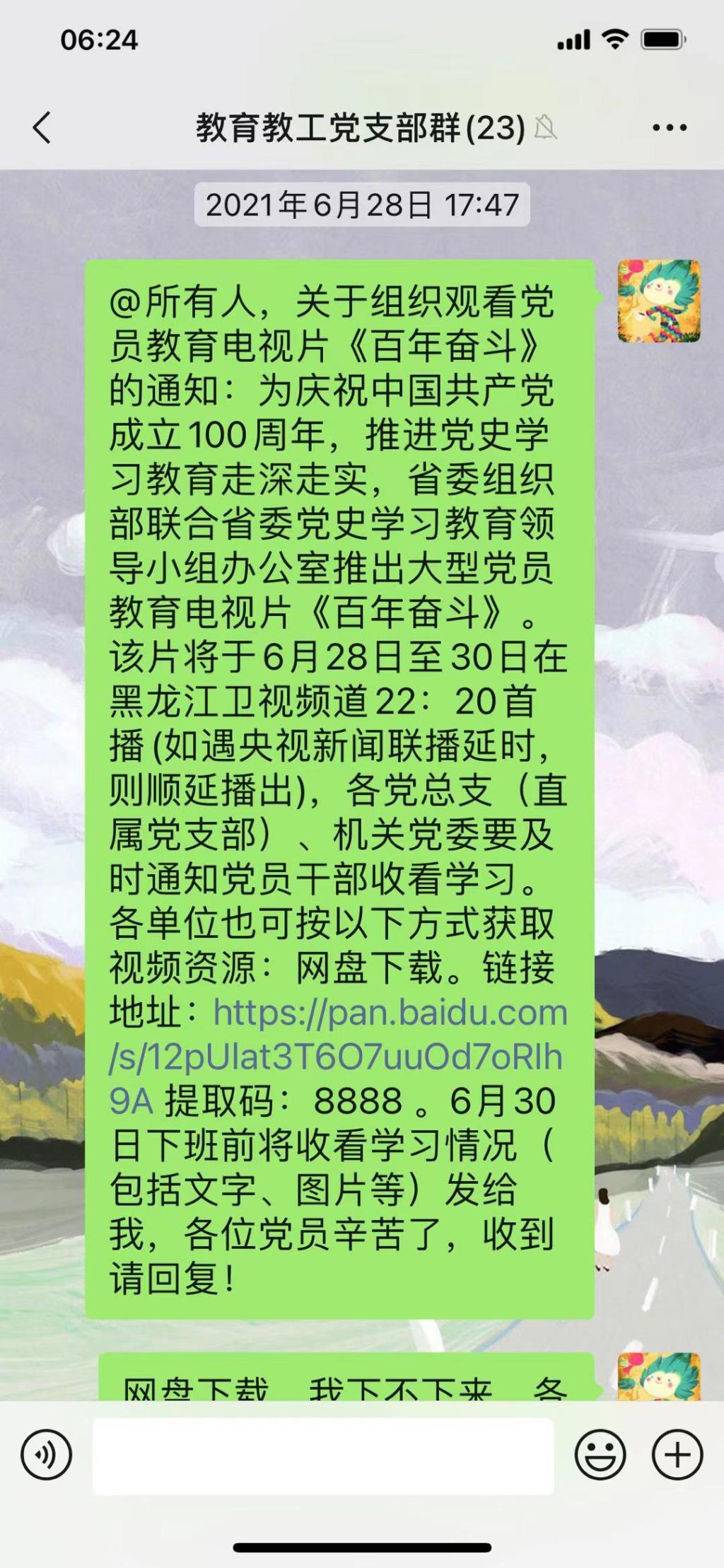 教育教工党支部收到上级党委通知后,积极组织党员观看影片《百年奋斗》电视片,并要求上交观后感。各位党员在接到通知后,也都行动起来,自行观看影片并上交观后感。
