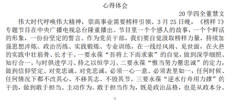 教工党支部全体党员观看《榜样7》后,大家一致认为,从古至今,中国人一直都有向榜样学习的优良传统,学习先进榜样,践行为民初心。榜样是一面旗帜,鼓舞斗志;榜样是一座灯塔,指引方向。这些榜样都具有崇高的品格和高尚的道德情操,他们用一生心系群众、恪尽职守、牢记使命、砥砺前行来履行共产党员的铮铮誓言,以实际行动践行共产党人全心全意为人民服务的宗旨。榜样引领,见贤思齐。榜样们用鲜活的实践彰显着各自的追求,学习他们,能使思想的力量、榜样的力量、人格的力量直达灵魂深处。学习榜样,就是要始终把人民生命安全和身体健康放在第一位,牢记人民的利益高于一切,站在人民的立场想问题、作决策、办事情,时刻与人民想在一起、干在一起,像关心家人一样关心群众,送关怀、知冷暖、解心忧,拜人民群众为师,向广大人民群众学方法、学经验,凝聚起人民群众的智慧和力量。