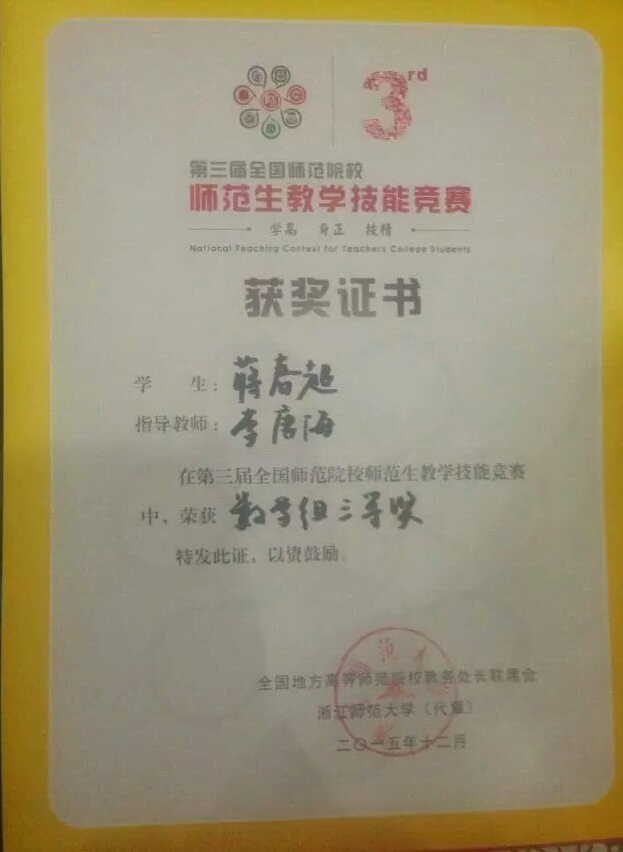 经过激烈的角逐,best365中国官方网站李唐海老师指导的员工蒋春超荣获数学组三等奖。通过本次参赛的历练,不但检验了best365中国官方网站数学与应用数学专业员工培养的成效,也增强了我们办精教师教育专业的决心和信心。