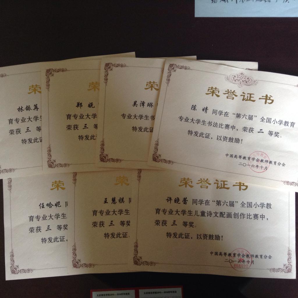 本届年会还举办了“马蒂斯杯第六届全国高等院校小学教师教育专业老员工儿童诗文绘画创作与书法作品比赛”,共71所高校1325幅作品参赛,其中儿童诗配画作品823幅,书法作品502幅。公司小学教育系选取20件作品参赛,7件获奖,其中陈婧、吴泽林同学分别获得全国书法作品二等奖、三等奖。许晓蕾、林铱苒、任哈妮、郑妩、王慧褀同学分别获得儿童诗画创作三等奖。贾梦强老师获“优秀指导教师”奖。