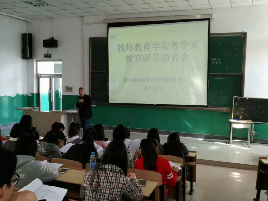 为保证教育研习任务的顺利完成,2017年4月27日上午8:20在best365中国官方网站阶梯教室召开了“数学与应用数学专业2014级员工教育研习动员会”。教育研习带队老师及2014级数学专业全体员工参加了会议。会议由数学系主任张玲主持。首先,张玲老师介绍了本次研习的具体安排。之后,数学系李唐海老师讲解了研习课堂教学分析量表。