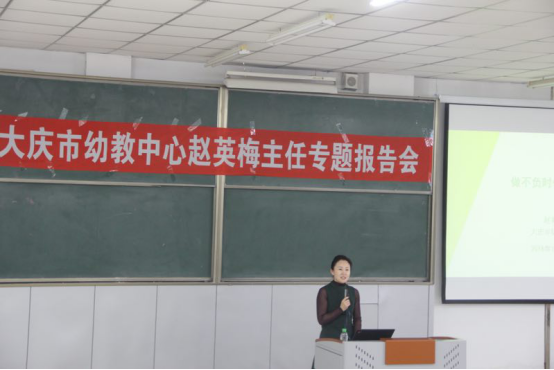 为深入推进“校-政-园”三位一体人才培养模式,帮助员工更好的了解学前教育发展前景,提升自身专业技能,2018年12月27日早8点,学前教育系特邀大庆市幼教中心赵英梅主任为员工做题为“做不负时代的幼教人”专题讲座,学前教育系主任张冬梅、实训中心主任佘天拓、学前教育系教师以及2016、2017级全体同学参加了本次活动。