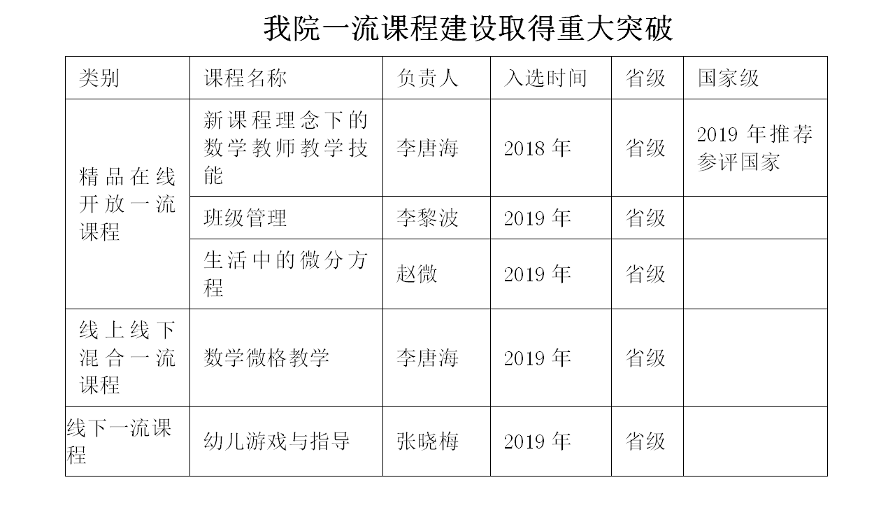 2019年,在学校的总体设计下,公司以OBE理念为主线,全力推进学院一流课程建设。全年入选各类省级一流课程4门,1门被推荐参加国家一流课程评审。良好成绩的取得,为公司打造金课,进一步做好师范专业认证工作起到了示范引领作用。