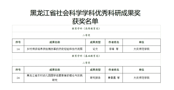 日前,黑龙江省社会科学界联合会公布了《关于公布2023年度黑龙江省社会科学学科优秀科研成果评奖获奖名单》,李锋老师的《乡村团队培养供给侧改革的历史经验和当代观照》和黄春晨老师的《黑龙江省农村幼儿园国学启蒙教育的理论与实践研究》分别获得教育学科 (高等教育类)二等奖、教育学科 (基础教育类)二等奖。