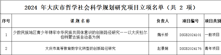 大庆市哲学社会科学规划办公室公示了《关于2024 年大庆市哲学社会科学规划研究项目立项名单》,公司教师在此次项目立项中获批2项,分别是魏长骄老师主持的《少数民族地区青少年铸牢中华民族共同体意识的创新路径研究——以大庆杜尔伯特蒙古族自治县为例》和赵景娴老师主持的《大庆市高等教育数字化转型的创新路径研究》。