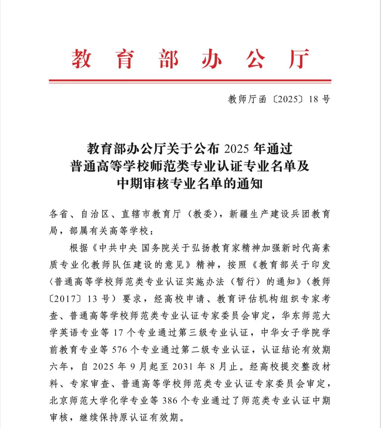 近日,教育部办公厅正式发布《2025年通过普通高等学校师范类专业认证专业名单及认证中期审核专业名单的通知》,公司学前教育专业顺利通过普通高等学校师范类第二级认证中期审核,充分彰显了学前教育专业在人才培养和专业建设方面的扎实成效与综合实力。