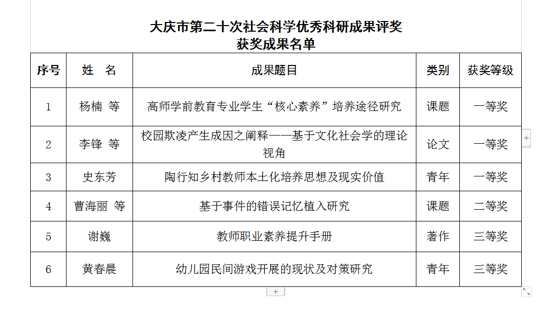近日,大庆市社会科学优秀科研成果评奖委员会办公室公示了大庆市第二十次社会科学优秀科研获奖成果,公司教师在此次评奖中获得一等奖3项、二等奖1项,三等奖2项,申报成果100%获奖,此次科研成果获奖是公司教师科研高水平的体现,也为下一步科研工作再上新台阶打下坚实基础。