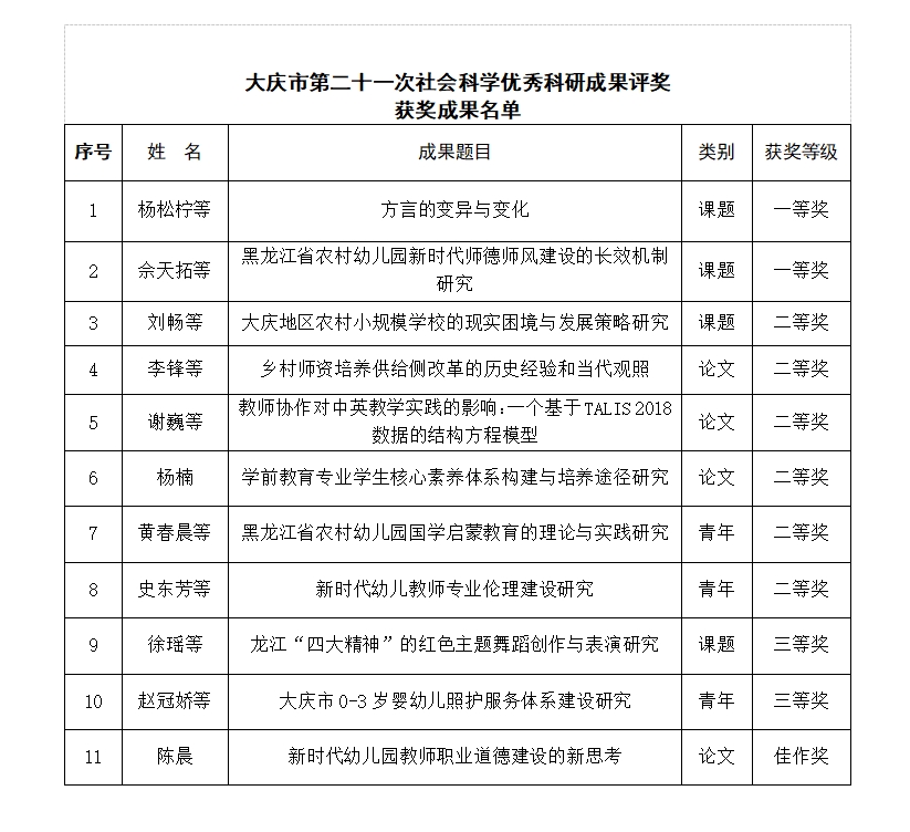 近日,大庆市社会科学优秀科研成果评奖委员会办公室公示了大庆市第二十一次社会科学优秀科研获奖成果,公司教师在此次评奖中获得一等奖2项、二等奖6项,三等奖2项,佳作奖1项,申报成果100%获奖。