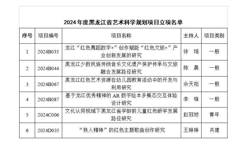 近日,黑龙江省文化和旅游厅公布2024年黑龙江省艺术科学规划项目立项结果,公司教师在此次项目立项中获批一般项目4项,青年项目1项,共建项目1。此次省级科研项目的获批促进了公司整体科研水平的提升,为公司科研工作的整体发展夯实了基础。