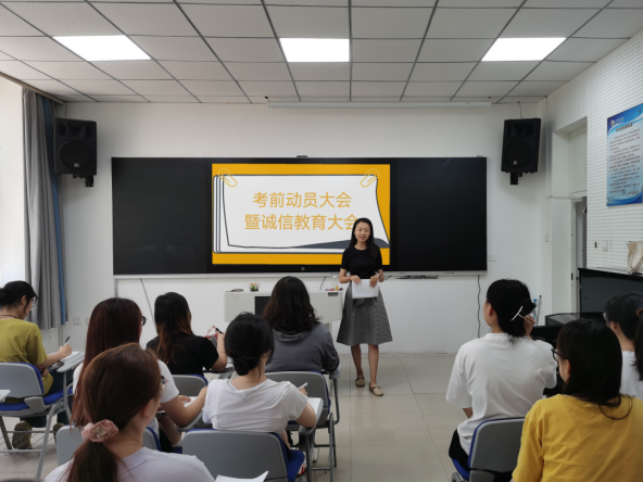 考前动员大会上,孟老师首先总结了本学期工作,根据老员工手册中的内容对期末诚信考试做出了明确要求。其次,她提出各位同学要做到诚信考试,在考试中检验自己的学习情况,发现自己需要提升的地方。最后,孟老师希望大家能够在考试中遵守考试纪律,在考试中发挥出自己最好的水平。此次会议营造了严于律己,严肃应考的氛围,传达了诚信考试,以诚立身的精神。