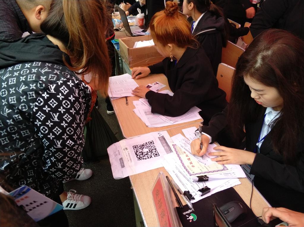 7点迎新工作准时开始,员工会各部门高度合作,有条不紊的帮助新生进行报到。