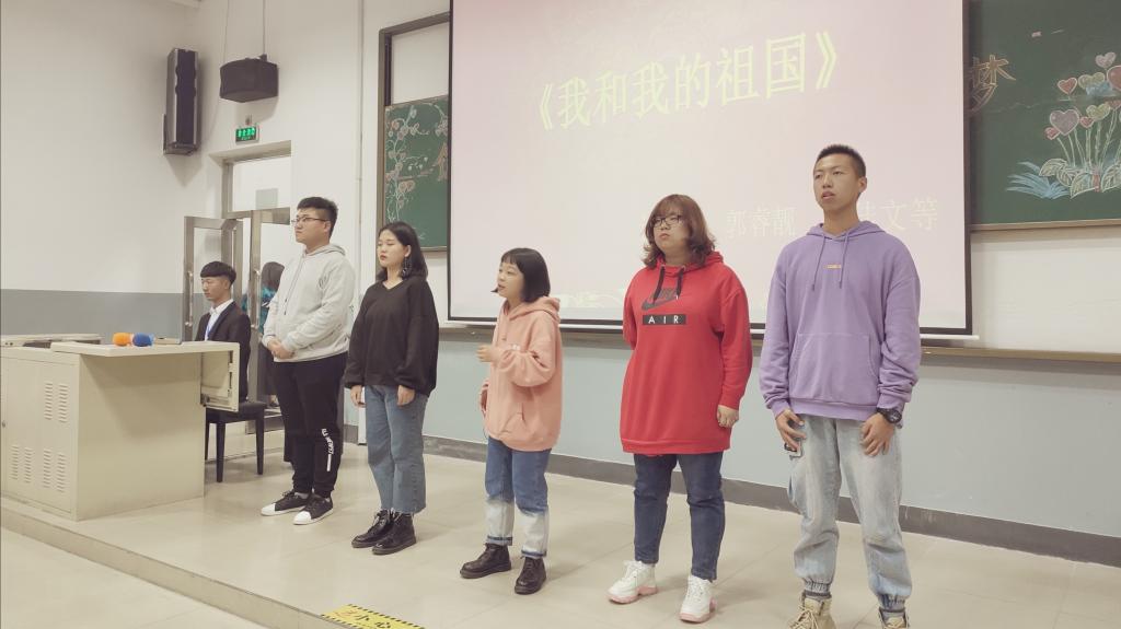 以小梦铸就中国梦,以青年之奋斗铸就祖国之强大。当代青年学子是祖国未来的希望,回首过去七十年的艰苦卓绝,展望未来悠悠华夏的繁荣昌盛,当代青年人更应该从我做起、努力奋斗从而实现祖国的复兴强大!大合唱《我和我的祖国》铿锵有力地道出了大家的爱国热诚,激起了台下同学们的阵阵共鸣。雄浑有力的歌声增强了集体的凝聚力,使在场的每位同学都感受到了红色文化、红色精神的号召!