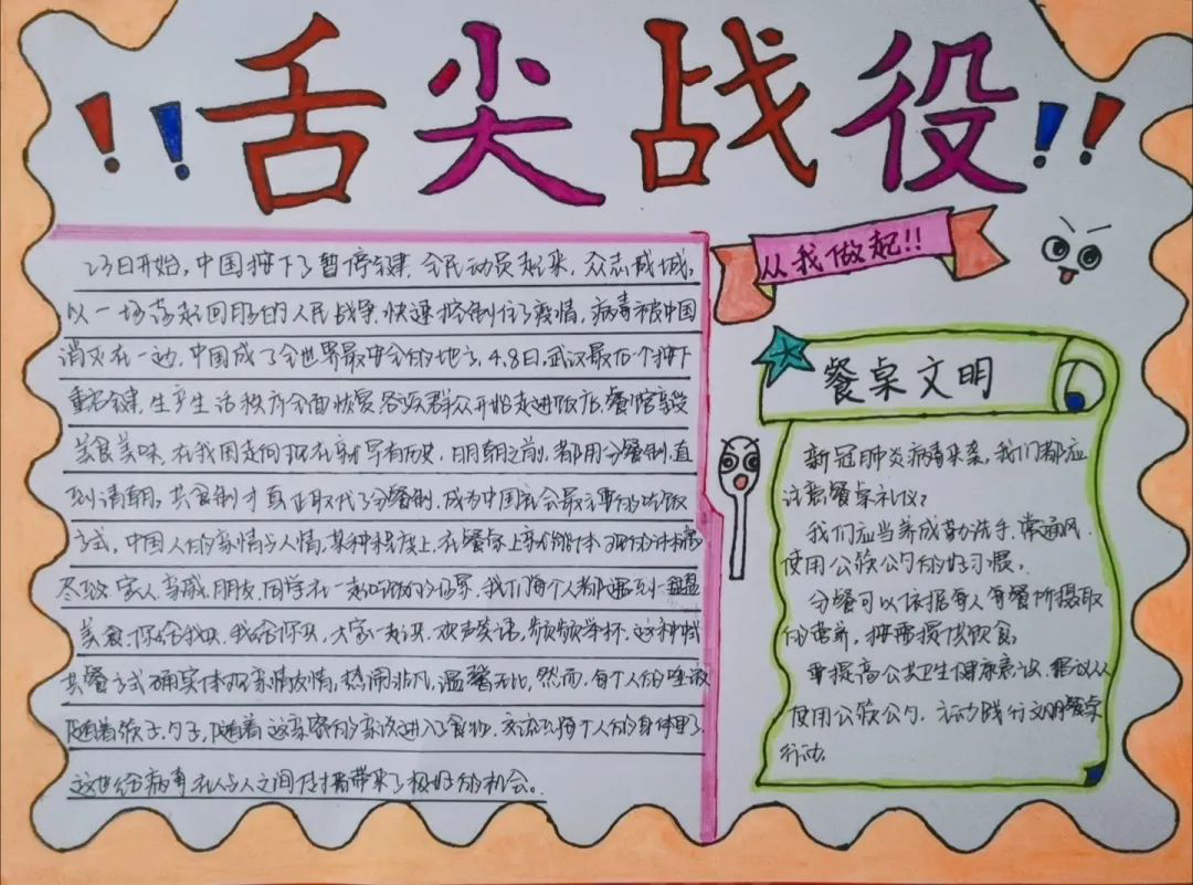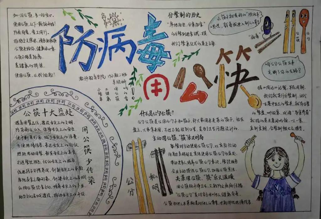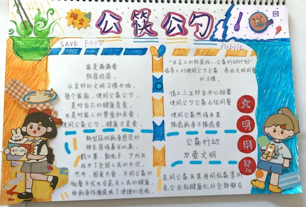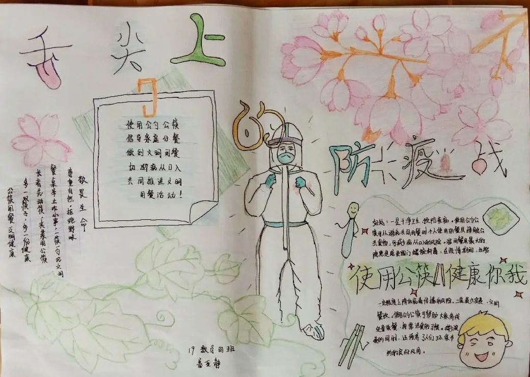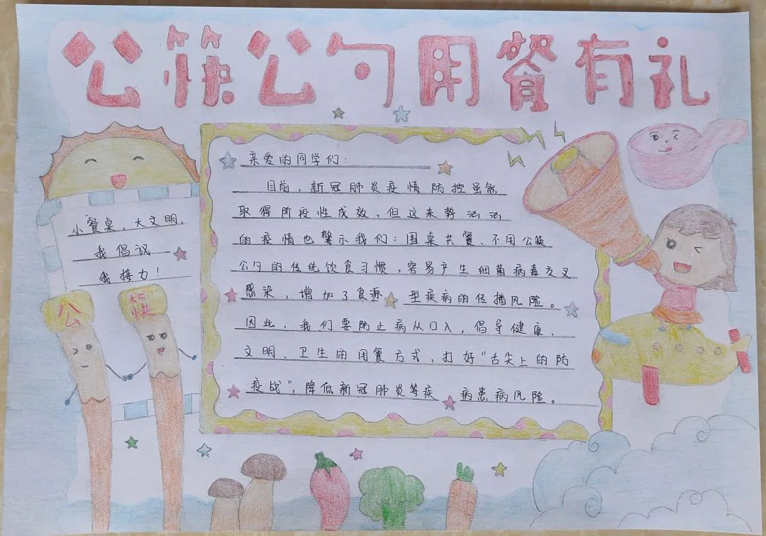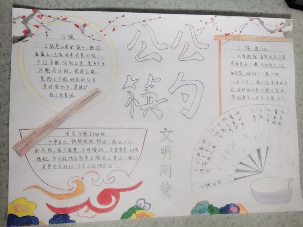 自“使用公筷,健康你我”行动开始至今,同学们都积极响应落实,纷纷发表自己的所想所得,切实贯彻自己的餐桌礼仪,以养成使用“公筷公勺”和餐前消毒餐具的良好习惯。不少同学也纷纷设计了新颖的标语,编写了相关文章,绘制了引人注目的手抄报,来加以呼吁和引导时代风尚,践行餐桌文明。