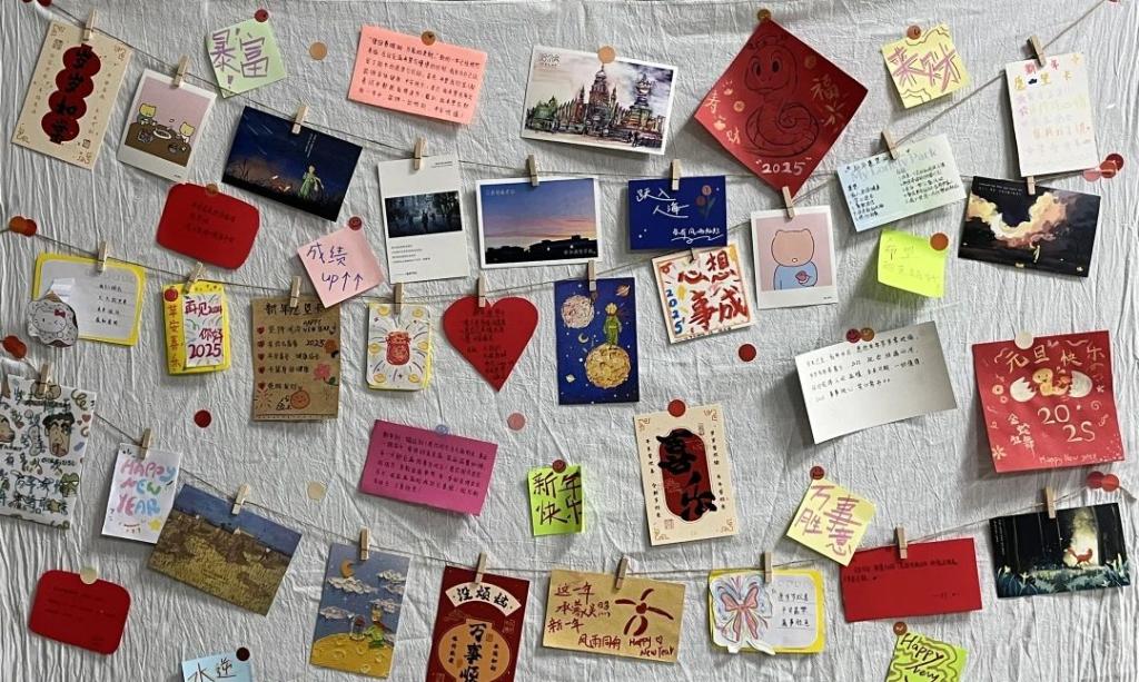 新年愿望墙和寄语明信片的设立,使一张张承载着纯粹祝愿的卡片飞向你我,用文字传递心意,让温暖跨越距离。墨香萦绕,书法如诗,同学们提笔书写与元旦有关的诗词,纵横间里渲染着浓厚的节日氛围。