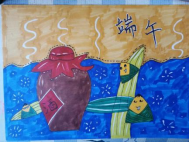 在端午节这天,最普遍的习俗就是喝雄黄酒、吃粽子,故作者以此二者为主体元素突出端午节这个主题。此外,画面背景以蓝色为主,蓝色代表着汨罗江,相传楚国大夫屈原便投江于此,表达了作者对端午的理解及对屈原的哀悼之情。
