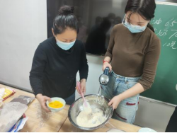 师生分工合作,有的按比例称重牛奶与面粉,有的将蛋清与蛋黄分离,有的搅拌食材。各种各样的食材,在大家手里不断变化形状,每个人都忙得不亦乐乎。