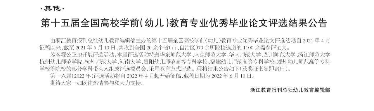 此该次评选活动自2021年4月征稿以来,截至6月10日,共收到全国20余个省(市、自治区)70余所院校选送的1100余篇参评论文,并特邀华东师范大学、南京师范大学、华南师范大学、四川师范大学、浙江师范大学杭州幼儿师范学院等院校的部分学科带头人组成评选委员会,采用双盲方式评选。获奖论文是全国研究生、本科生、专科生学前教育专业教师论文指导能力以及员工论文写作能力的一次高水平展示。