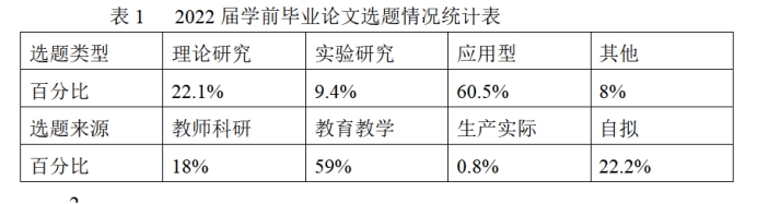 学前教育专业本届毕业论文指导员工共计145人,参与到本次毕业论文指导工作的老师共20人,其中包含幼儿园一线教师4名。论文选题选题注重综合、创新与应用,理论研究型论文选题占比22.1%;实验研究型论文选题占比9.4%;应用型论文选题占比60.5%。
