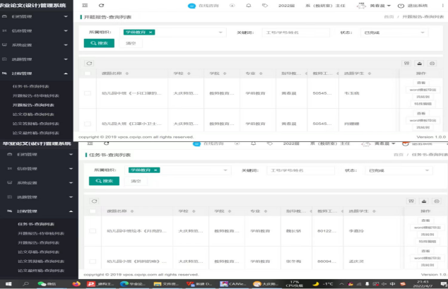 2022年3月21日—2022年4月3日,各组指导教师针对毕业论文开题进行细致指导,从选题背景与意义、研究内容与目标、研究方法与步骤等方面进行专业点评并提出改进意见,指导员工查阅资料、编制问卷、收集调查数据资料,特别是针对课例研究、歌曲创编、舞蹈创编类的实践性毕业论文更要完善过程性材料的收集存档和整理工作。各组指导教师与员工们精准对接,逐一指导,完成了开题报告相关工作。实训中心主任黄春晨和陈思琦老师认真开展线上“维普毕业论文(设计)管理系统”巡查工作,对开题报告内容、格式等进行检查并反馈修改意见。